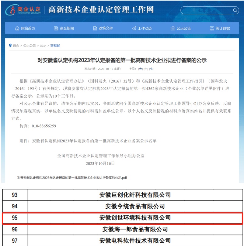 11月7日,全國高新技術(shù)企業(yè)認(rèn)定管理工作領(lǐng)導(dǎo)小組辦公室發(fā)布了《對安徽省認(rèn)定機(jī)構(gòu)2023年認(rèn)定報(bào)備的第一批高新技術(shù)企業(yè)進(jìn)行備案的公告》。安徽創(chuàng)世環(huán)境科技有限公司榮列其中,順利通過國家“高新技術(shù)企業(yè)”認(rèn)定。這一重大突破標(biāo)志著創(chuàng)世環(huán)境在技術(shù)創(chuàng)新和研發(fā)方面的顯著實(shí)力得到了國家層面的高度認(rèn)可。